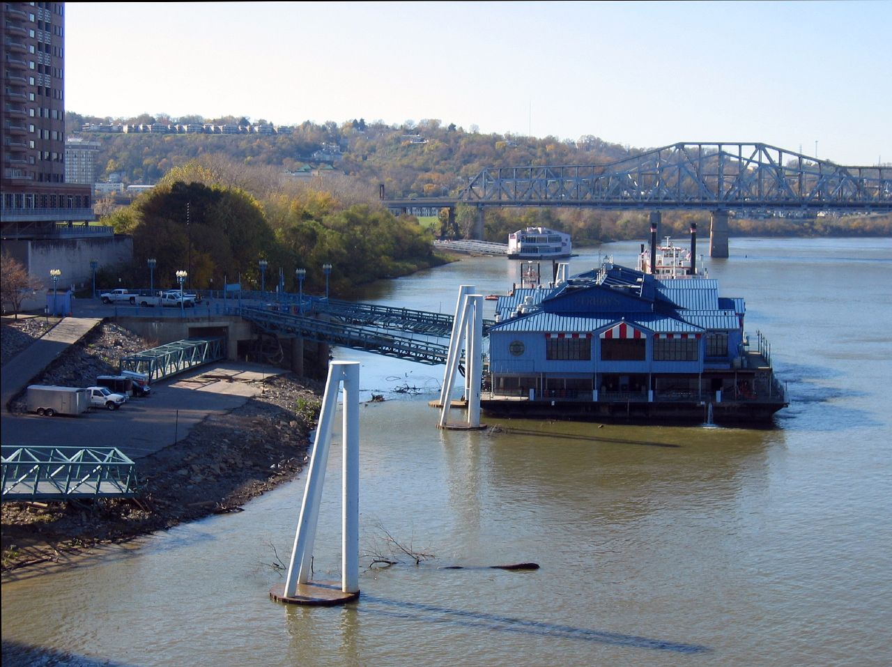 The story of Covington's floating restaurants doesn't end there though. Just west of the Fink, there's two concrete docks jutting out from the walkway along the city's flood wall. They offer great views of Cincinnati's skyline, but there's this unfinished air about them. Orange construction netting and crowd barriers block off gaps in the blue colored steel fence. Three white piers rise vertically out of the river and a parking lot lines the river bank below. There's something missing and what's missing was one of Covington's other floating attractions: The Covington Landing.