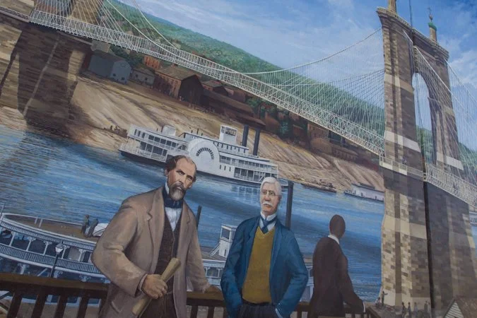 Back above, a mural on the flood wall depicts two men standing in front of a steamboat on the Covington riverfront - eerily similar to the earlier photograph of Wachs and Bernstein at the Covington Landing's opening.
