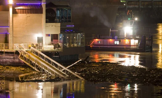 I remember getting off work and coming home to see local social media exploding with the news: Jeff Ruby's Waterfront restaurant had broken away from the shore and floated down river. My roommates and I grabbed a camera and headed over to Covington where a sea of onlookers and sensational local media were camped out at the scene.