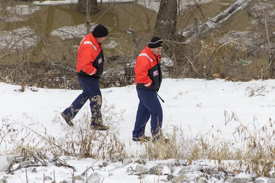 Members of the U.S. Coast Guard walk along the bank of the Ohio River near where The Waterfront came to rest.
