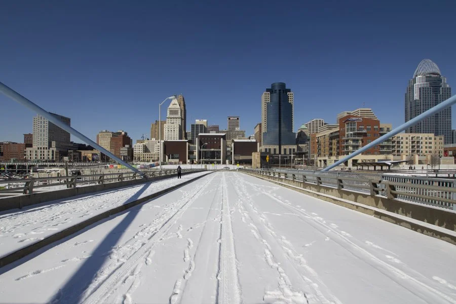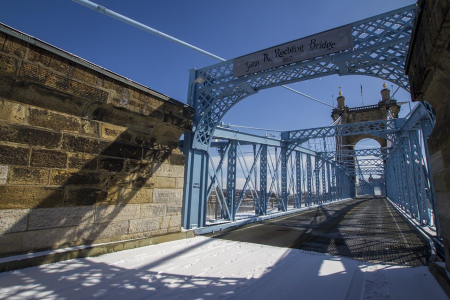 The iconic Cincinnati river crossing shares a similar look with its younger, but larger brother in Brooklyn, New York. While created in the same image of their architect father, John Augustus Roebling, their pedestrian access is dissimilar. In Brooklyn, pedestrians can walk right down the center, taking in a symmetric view of the steel cables that hold the bridge from atop the stone towers - while in Cincinnati, you're restricted to the sides. That is, unless, the bridge is closed to vehicular traffic and you're willing to walk on the icy, metal surface.