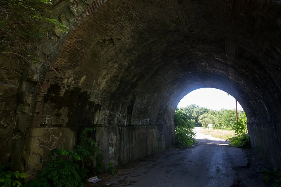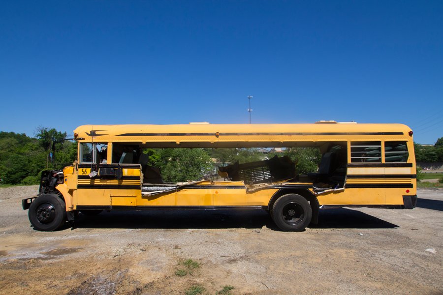 In this case: an old road, a tunnel and what's left of a school bus.
