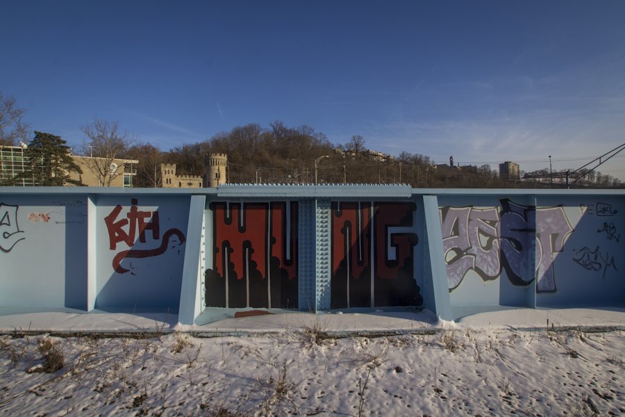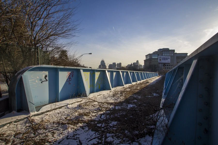 Above I-71, a bright blue railroad bridge spans the freeway canyon, but doesn't actually carry trains anymore. A remnant of an old rail line, the steel path can still be used as a shortcut over the highway if you know where to find it.