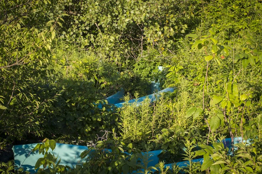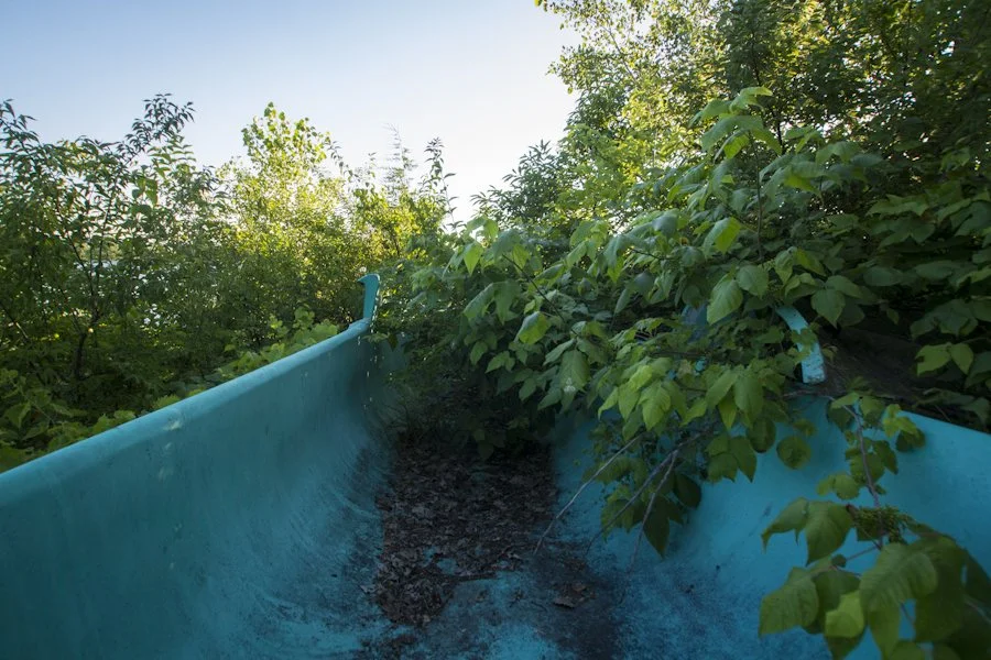 An abandoned water slide overgrown with brush.