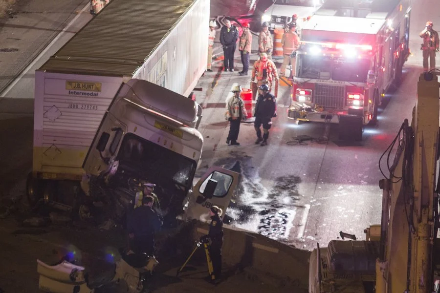 Police officers, firemen and construction workers survey the scene. The driver of the above truck survived the incident with injuries, the fatality of a construction worker has been reported.