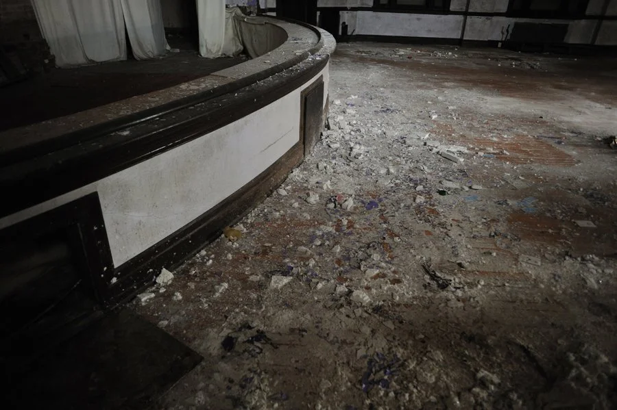 Rubble and peeling paint on the floor of the main auditorium.