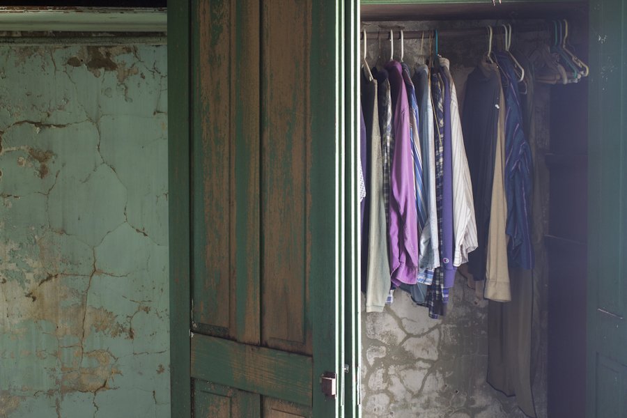 In one room, old clothes still hang in a closet.