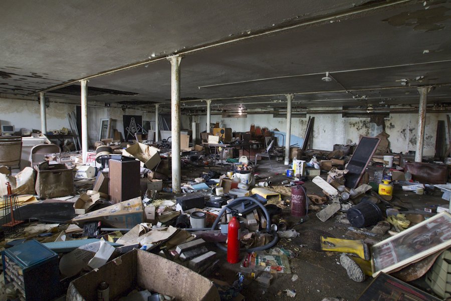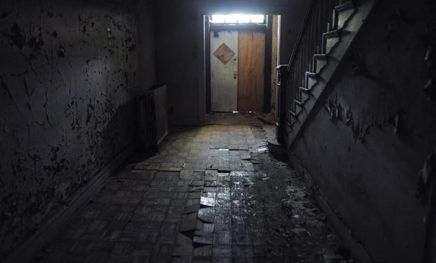 The main staircase has completely collapsed, paint peels on nearly every wall and broken windows have allowed the weather to make its way in.