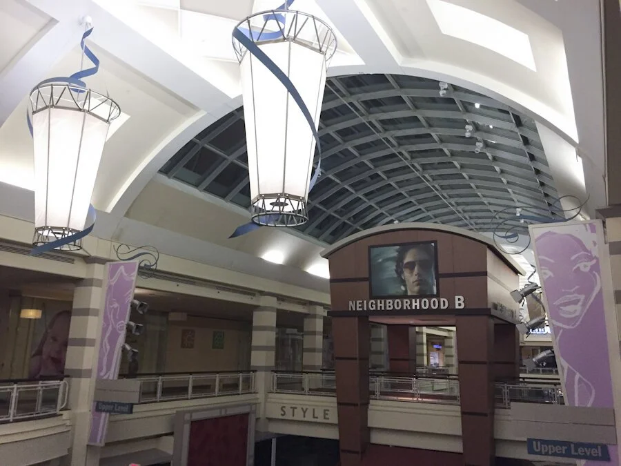 The mall was designed with massive skylights adorned with brass decoration. During the day, they allow for a ton of natural light to come pouring in, but at night the mall is incredibly dark. So many lights within the mall are either turned off or seem to no longer work. The lack of light gives the mall a foreboding look, with hallways appearing similar to dark alleyways in some sections. Your first instinct upon seeing the dark hallways is that the area isn’t open to the public. But the occasional friday evening mall walker lets you know that you’re apparently free to walk where you please.