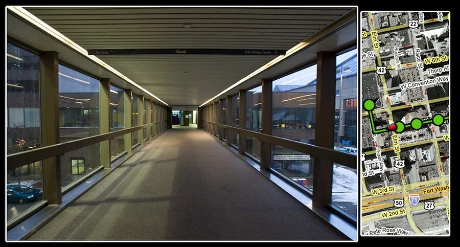 As for the original post/gallery—like the skywalks themselves—it was quickly outdated. The “virtual tour” was created via Adobe Flash. Is your Flash Player up to date? Doesn’t matter, because no one’s using Flash anymore, specifically because many smartphones never jived with it. After all of QC/D disappeared for a few moments during some technical issues, I opted to not bother restoring the old Flash gallery. It would’ve taken too much time and hell, who could’ve seen it anyways? Would anyone really want to see documentation of the Cincinnati Skywalk system as it was in December of 2008?
