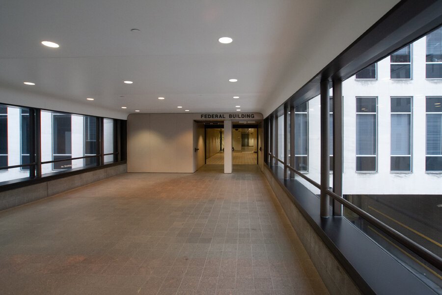 A bridge to the John Weld Peck Federal Building over Paulding Alley.
