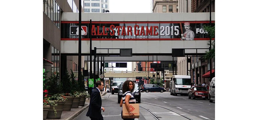 The branch that connects over Walnut St. to the Mercantile Center as seen in the summer of 2015, decorated for the Major League Baseball All Star Game.