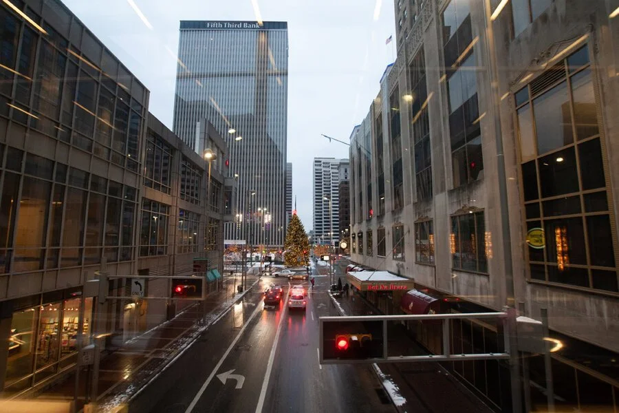 Looking east from the West 5th St. bridge with Fountain Square’s Christmas tree and the Fifth Third Center in the distance. The Carew tower is to the immediate right.