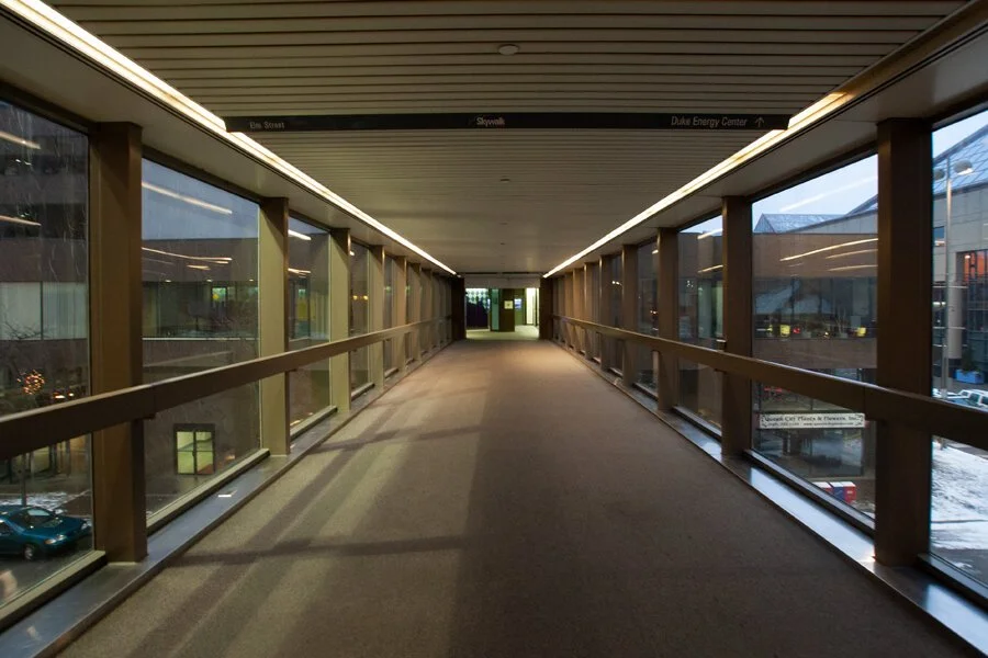 Skywalk over West 5th St. connecting to the Duke Energy Convention Center. Note that this section is mostly open to the elements.