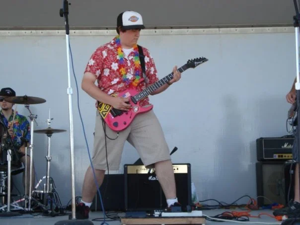 I think that shirt belonged to my mom, the hat belonged to my buddy Nick, and the shorts were uniform issue from the amusement park I worked at. Still have, and love, that guitar.
