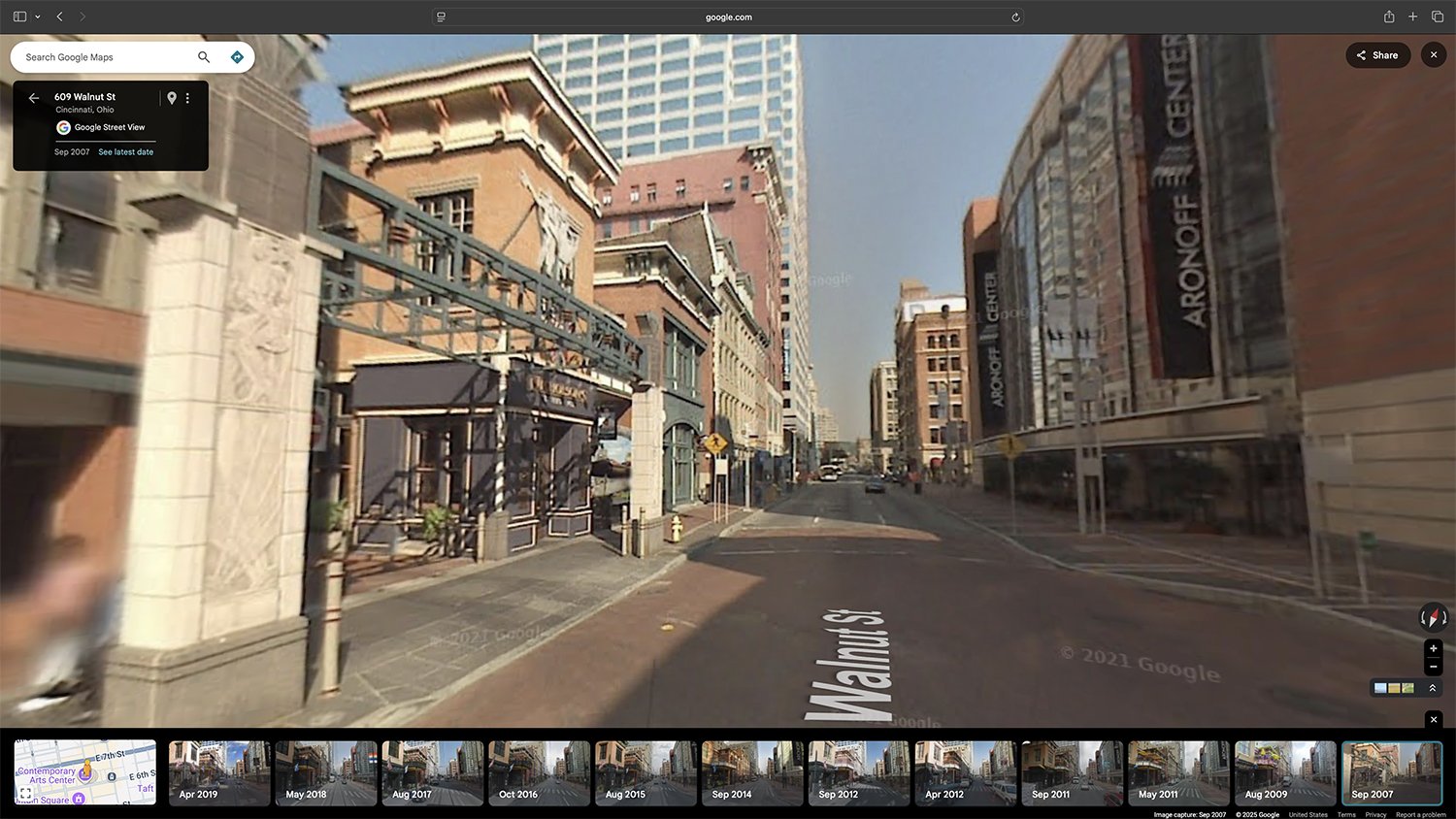 The district’s Walnut St. entrance as seen on Google Street View in September 2007. At this time, the area still featured a decorative archway similar to the one still found on Walnut St. Brick pavers also extended into the roadway. This area was heavily modified and rebuilt to accommodate the Cincinnati Streetcar.