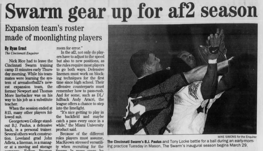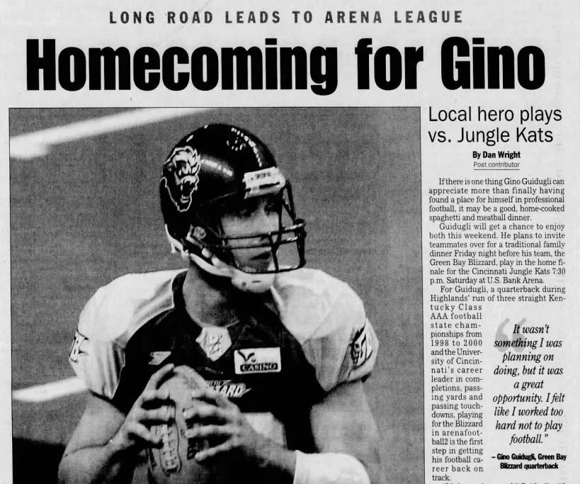 Clip from the July 12, 2007 edition of ‘The Cincinnati Post’ highlighting native football standout Gino Guidugli returning home to play against the Jungle Kats.