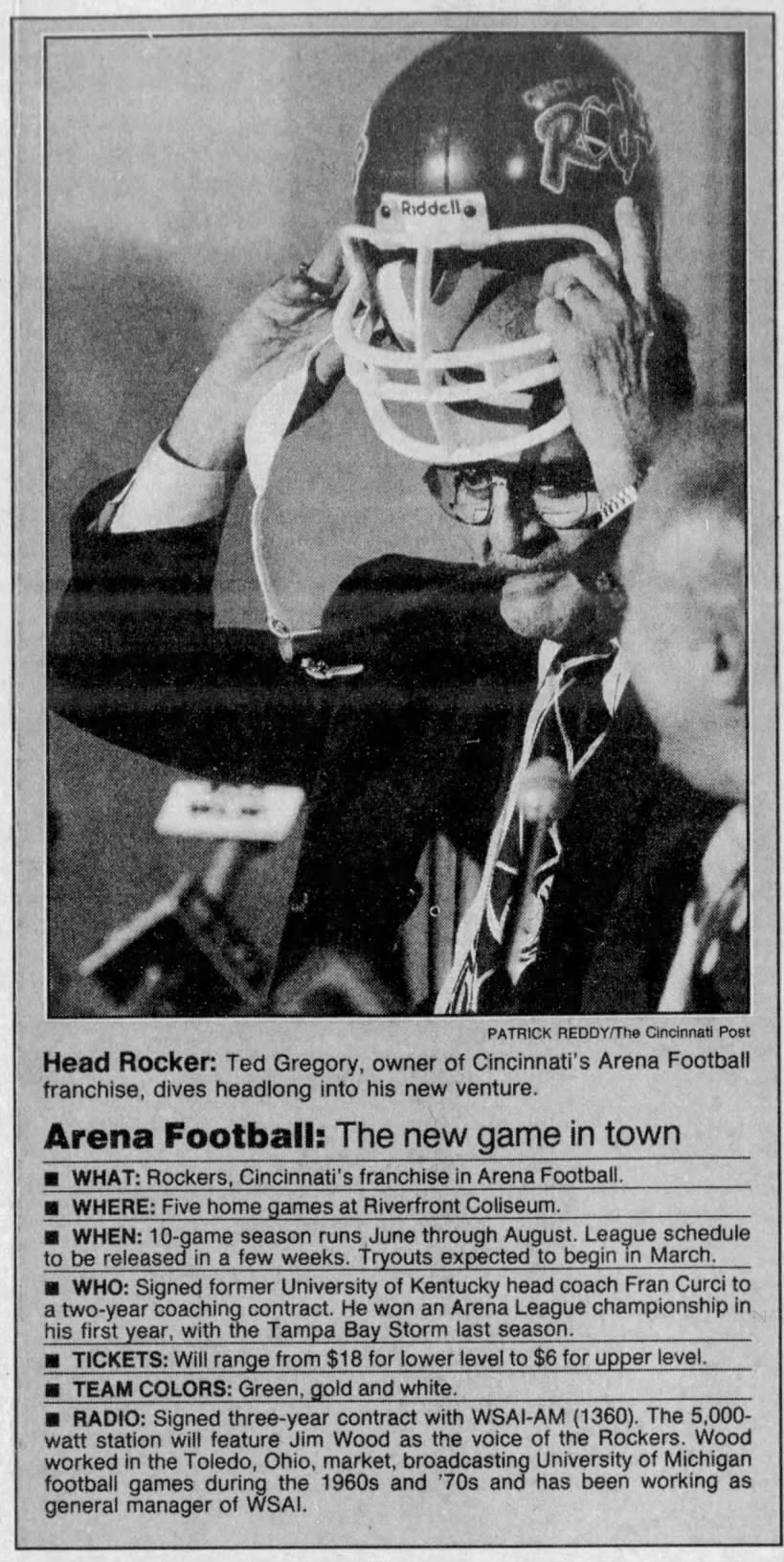 The Cincinnati Rockers were announced by prominent, local father-son restauranteurs Ted and Tom Gregory (of Montgomery Inn ribs fame). The team began play in 1992 just as the next-door Bengals of the NFL were entering a particularly sordid period in their overall mediocre history. Whether folks were looking for a winning team or just curious to see the novelty of indoor football in-person, the Rockers claimed to have impressively sold “more than 5,700” season tickets for their inaugural campaign. They’d lose in the first round of the playoffs, but the team was able to boast a winning record and postseason berth right from the start.