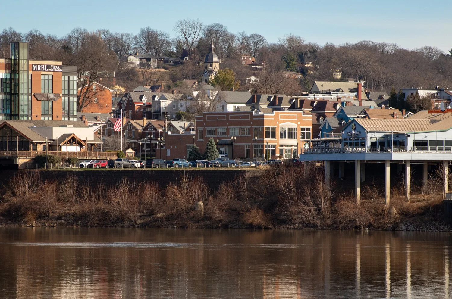 Main St. The space on the right used to be the historic Dennison Hotel building.