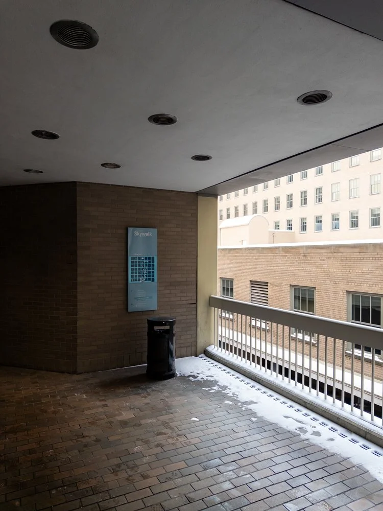 Both the envisioned and realized versions of the network accomplished the basic goal of linking most of the city center between the convention center and the old stadium, but a fair amount of the pathways were open-air; so while they provided a potential shortcut, they only offered modest protection from the elements. And no matter what decade you traversed the system in: there was always some combination of dead-ends, locked doors, limited hours, and forced deviations to the street-level. Aided by the decline of brick and mortar retail in the early aughts, skywalks eventually became passé among the trends of urbanism outside of cities with extreme weather.