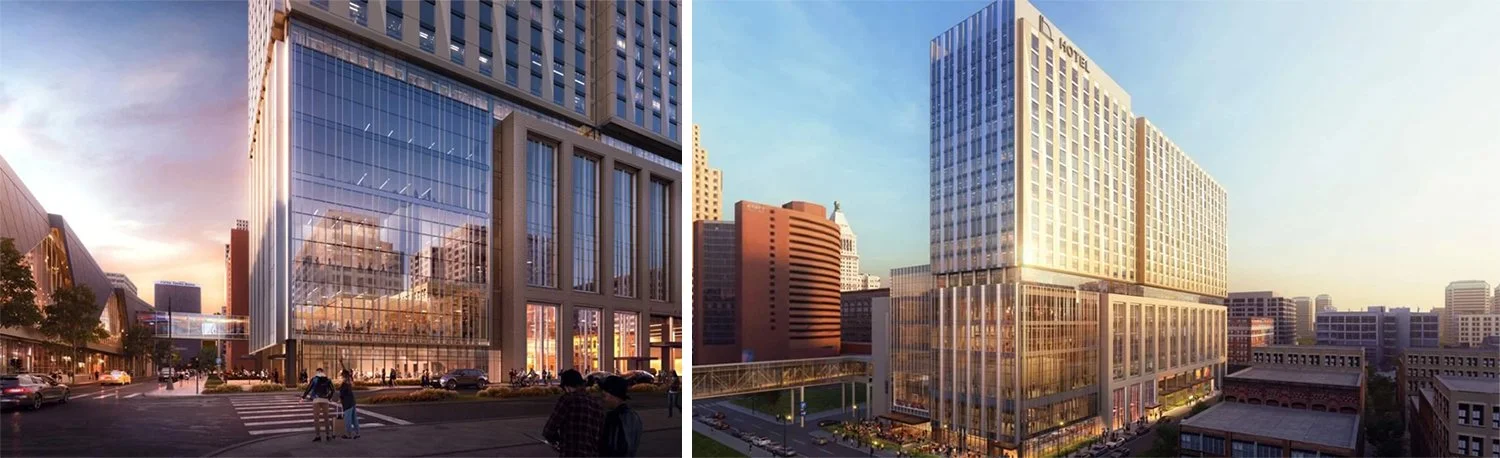 Renderings of the planned hotel as showcased by Visit Cincy. The new “skywalk” can be seen on the left side of each image.