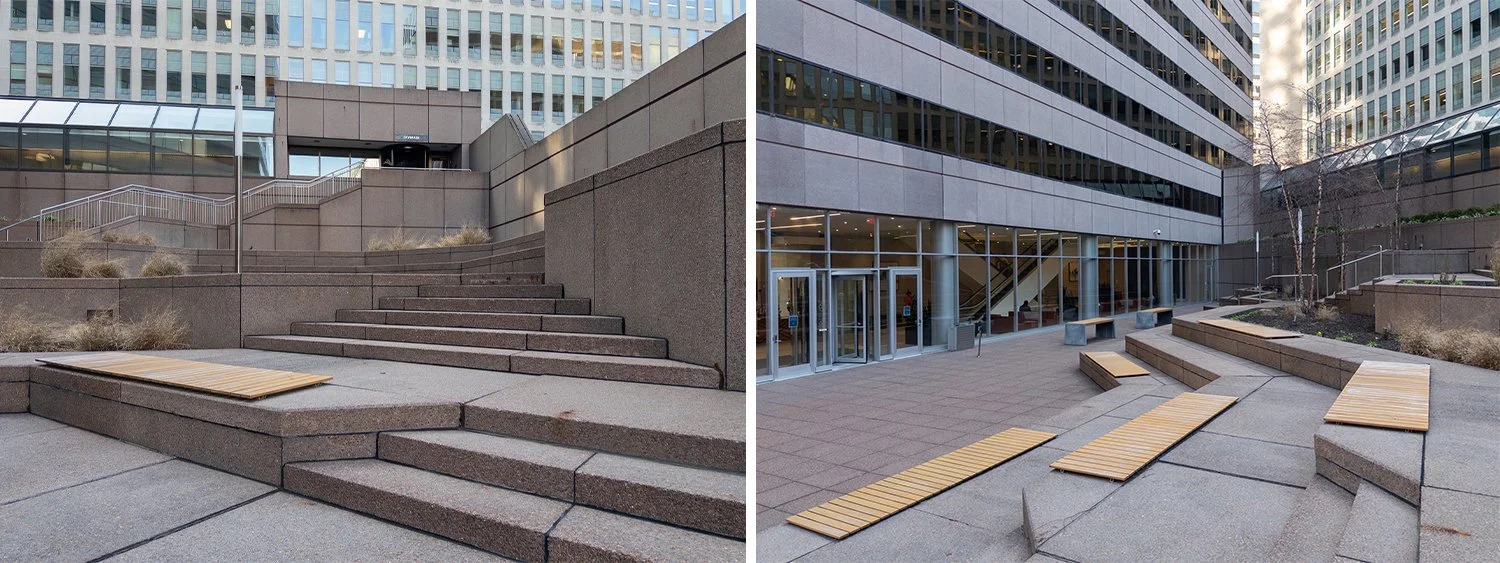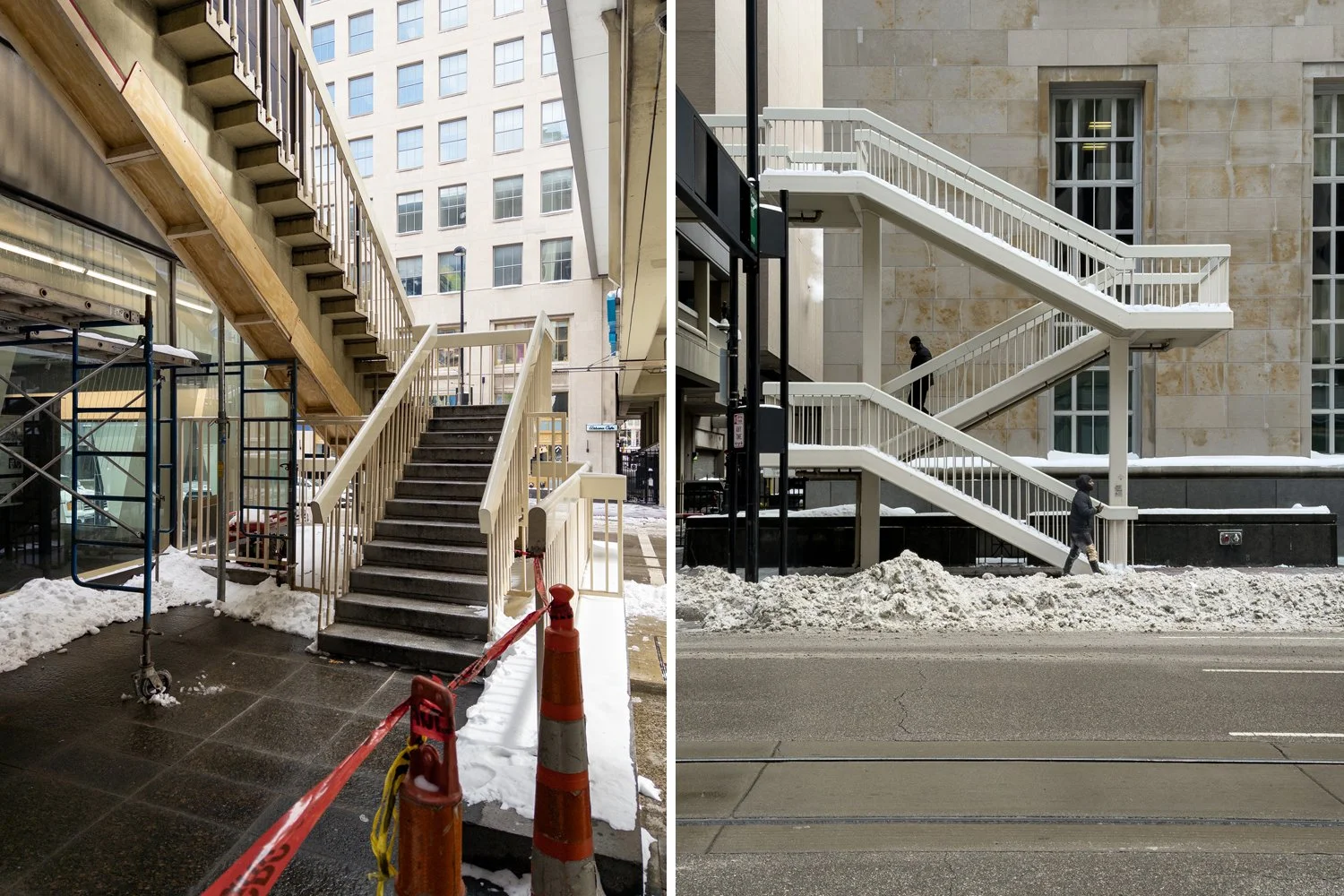 Street-level connections to the Walnut St Skywalk bridge. Maintenance work can be seen underway in the left photo.