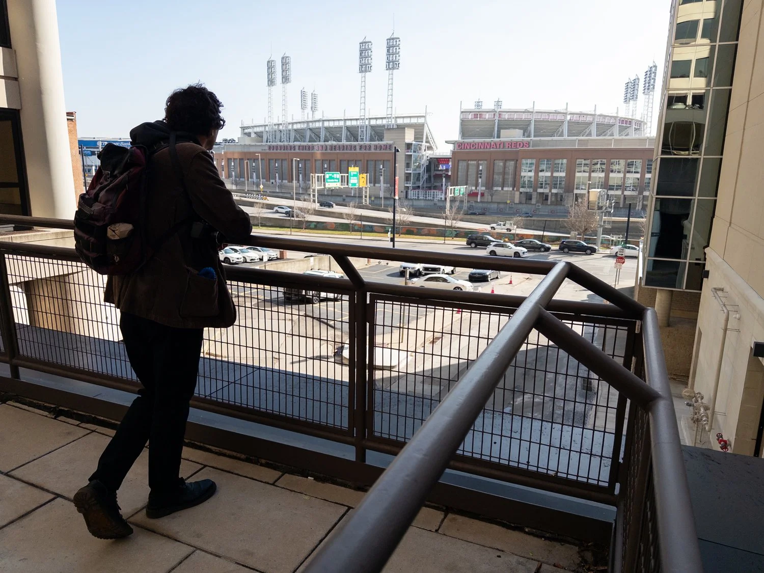 Cedric overlooking the location of a former stadium Skywalk bridge from the patio of Atrium II. The Reds’ Great American Ballpark can be seen in the distance.