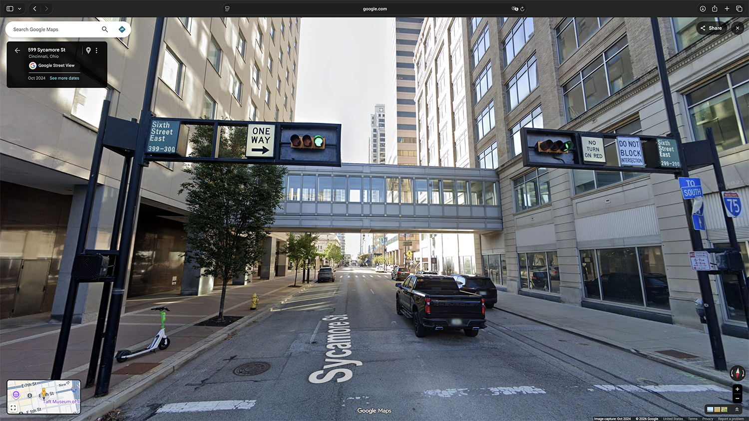 The former Procter & Gamble “skywalk” over downtown Cincinnati’s Sycamore St as seen on Google Street View in October 2024.
