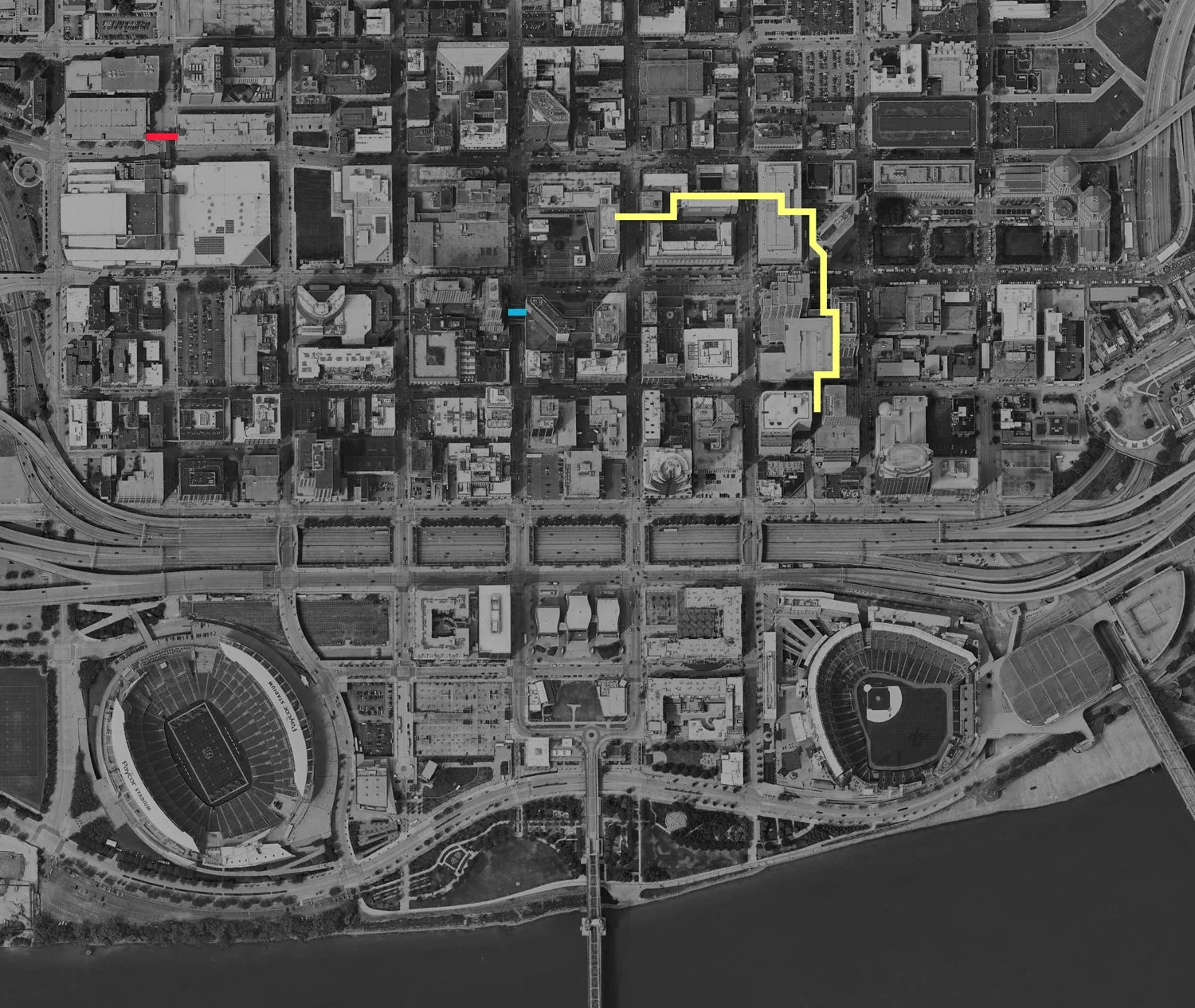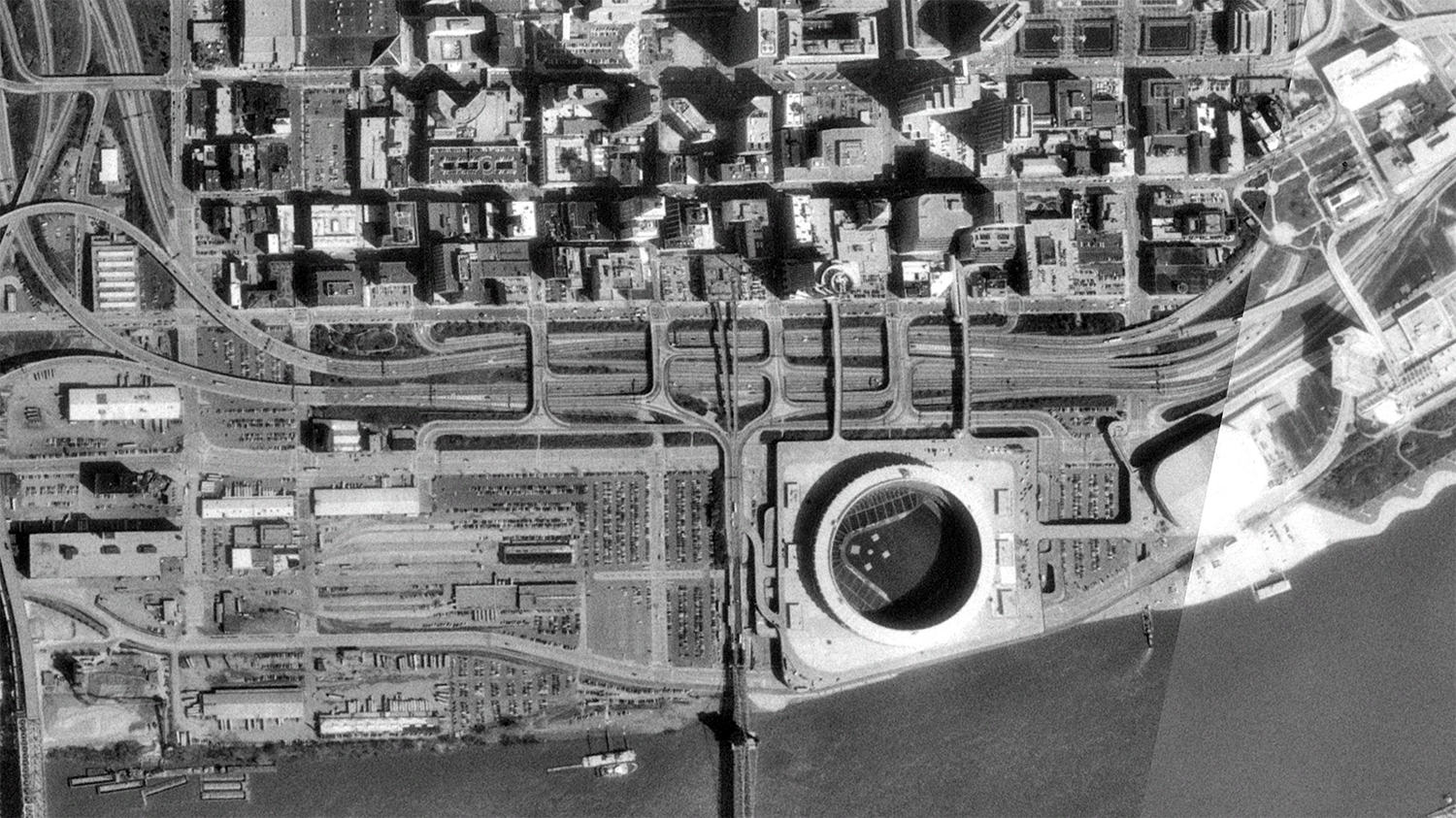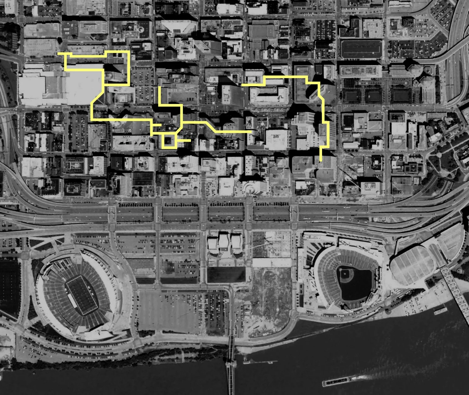 Downtown Cincinnati and its riverfront as seen in 1993 aerial imagery from the U.S. Geological Survey/Google Earth.