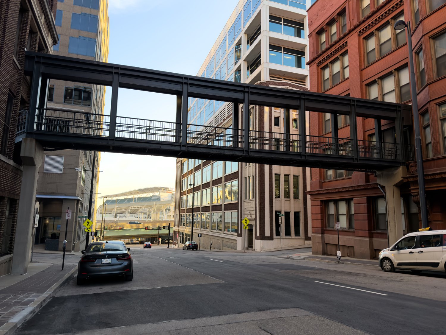 Open-air pedestrian bridge between two residential buildings above Plum St on the west side of downtown.