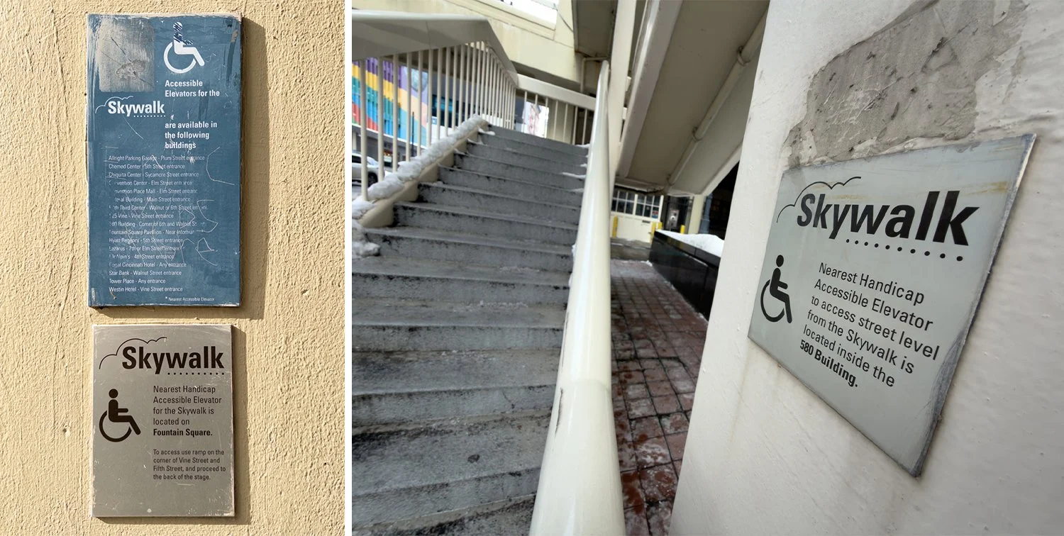The Skywalk had originally continued straight through and above to Fountain Square, but that segment was removed among a remodeling of the city center in the early 2000’s. At that point, the bridge above Walnut St then became a forced detour to the street-level where the sidewalk then continued through to the square. Following the tragic shooting of 2018, however, a renovation of both the Fifth Third Center’s lobby and Fountain Square removed any access from Walnut St. This isn’t necessarily a commentary on that civic planning decision, but I mention it to illustrate how the utility of Cincinnati’s Skywalk has changed significantly over time, especially with how it has long been disconnected from the city center.