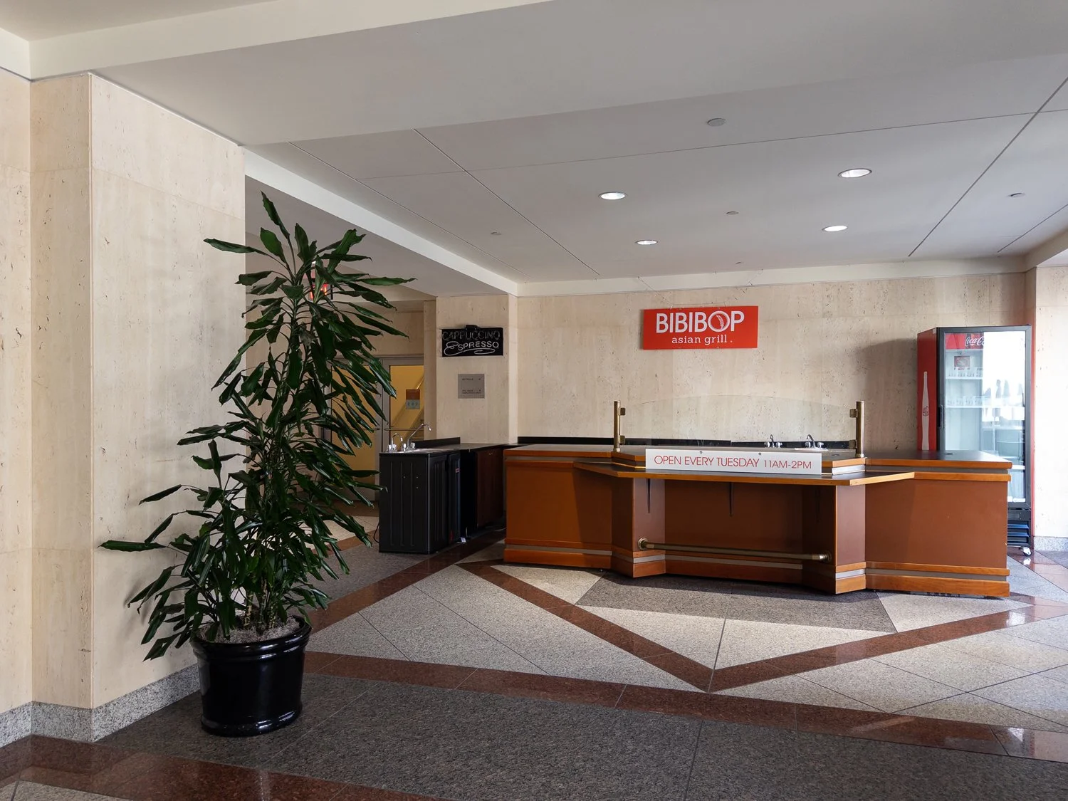 Bibibop location on the First Financial Tower’s Skywalk level with signage advertising operating hours of 11 a.m. to 2 p.m. on Tuesdays.