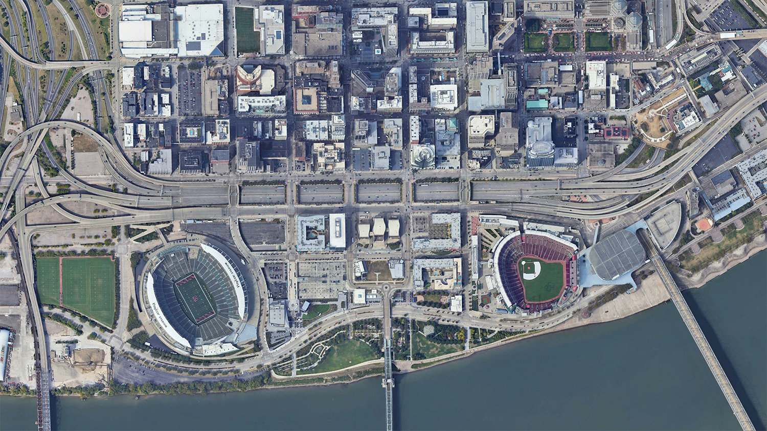 Downtown Cincinnati and its riverfront as seen in 2023 aerial imagery from Google Earth.