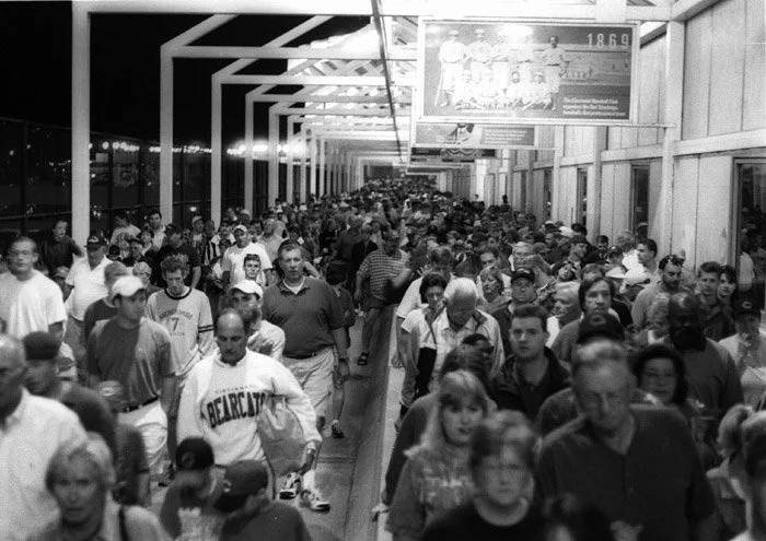 Much has been made of the dark, protean energy of crowds. The Skywalk connectors were just a couple of hundred yards from Riverfront Coliseum, site of the December, 1979 Who concert tragedy. But I’m struck now by the generous, happy-go-lucky vibe of those Reds fans in the late nineties. We were seldom hassled. Occasionally we were told to move on, to get a job. But mostly we felt like we were part of the scenery. Unmanipulated, unafraid, the crowd has simple wants and needs. It’s a carrier of collective emotion, a source of money, happiness, sustenance. We made hundreds of dollars some nights, each of us, playing in groups of two to five, just playing and having fun.