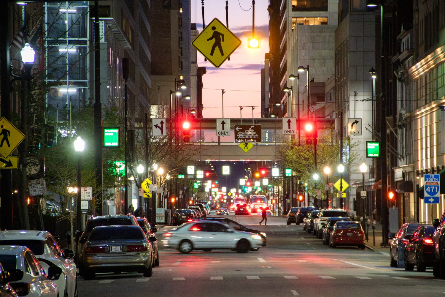 Skywalk seen in the distance along Fourth St during the summer of 2025.