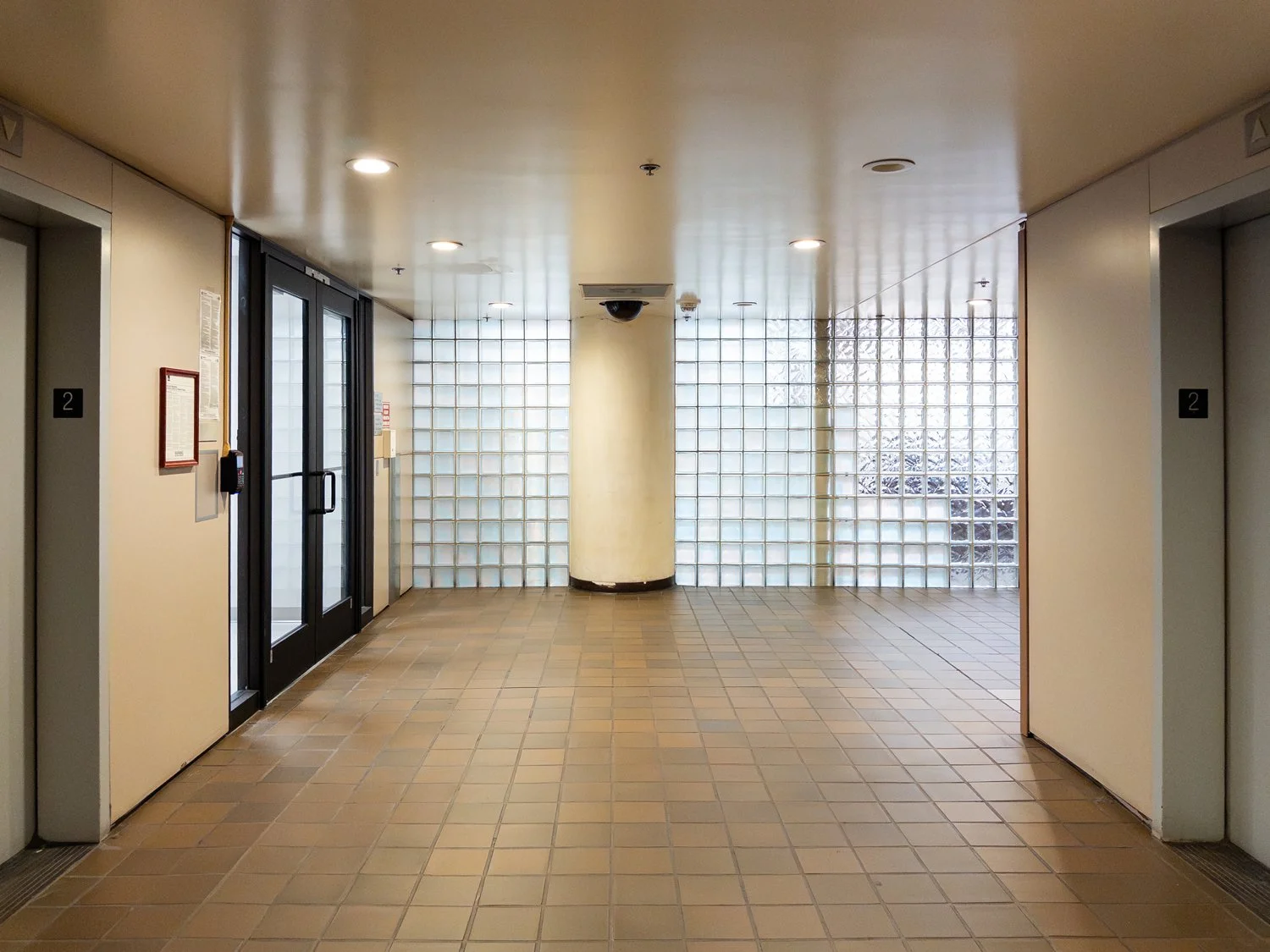 After retracing our steps, we continued westward through the John Weld Peck Federal Building. This area has always had an austere vibe due to security needs—a point illustrated by the evolution of cameras on display where black balls with tiny, digital eyes are now mounted in abundance alongside the dusty remains of their analog and obsolete surveillance predecessors.