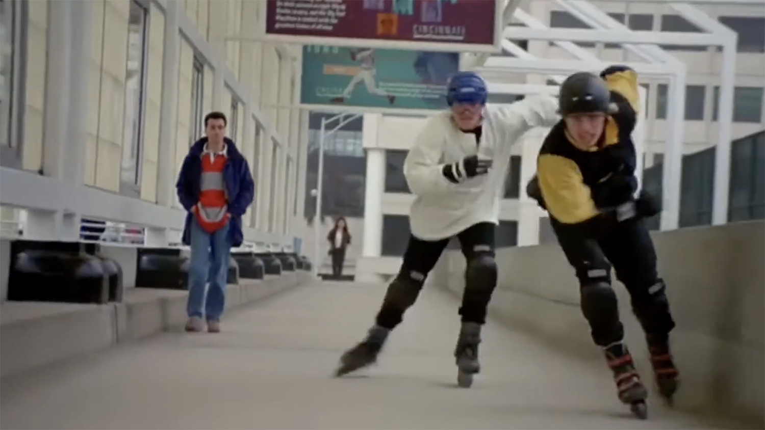 The rollerblading characters of Jack and Blane duke it out on a stadium skywalk section as seen in 1993’s “Airborne.”