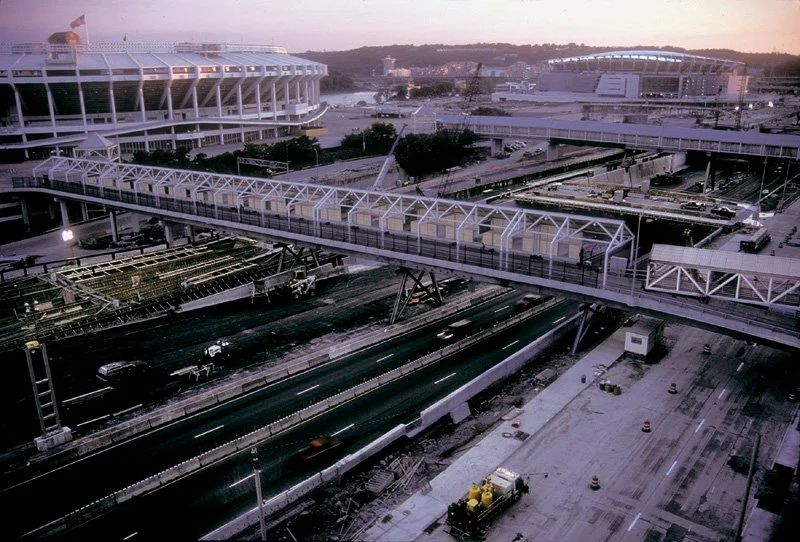 Bridges connecting the former Riverfront Stadium/Cinergy Field with Atrium II/2nd St. as seen in the Summer of 2002 above the work being done to reconfigure Fort Washington Way.