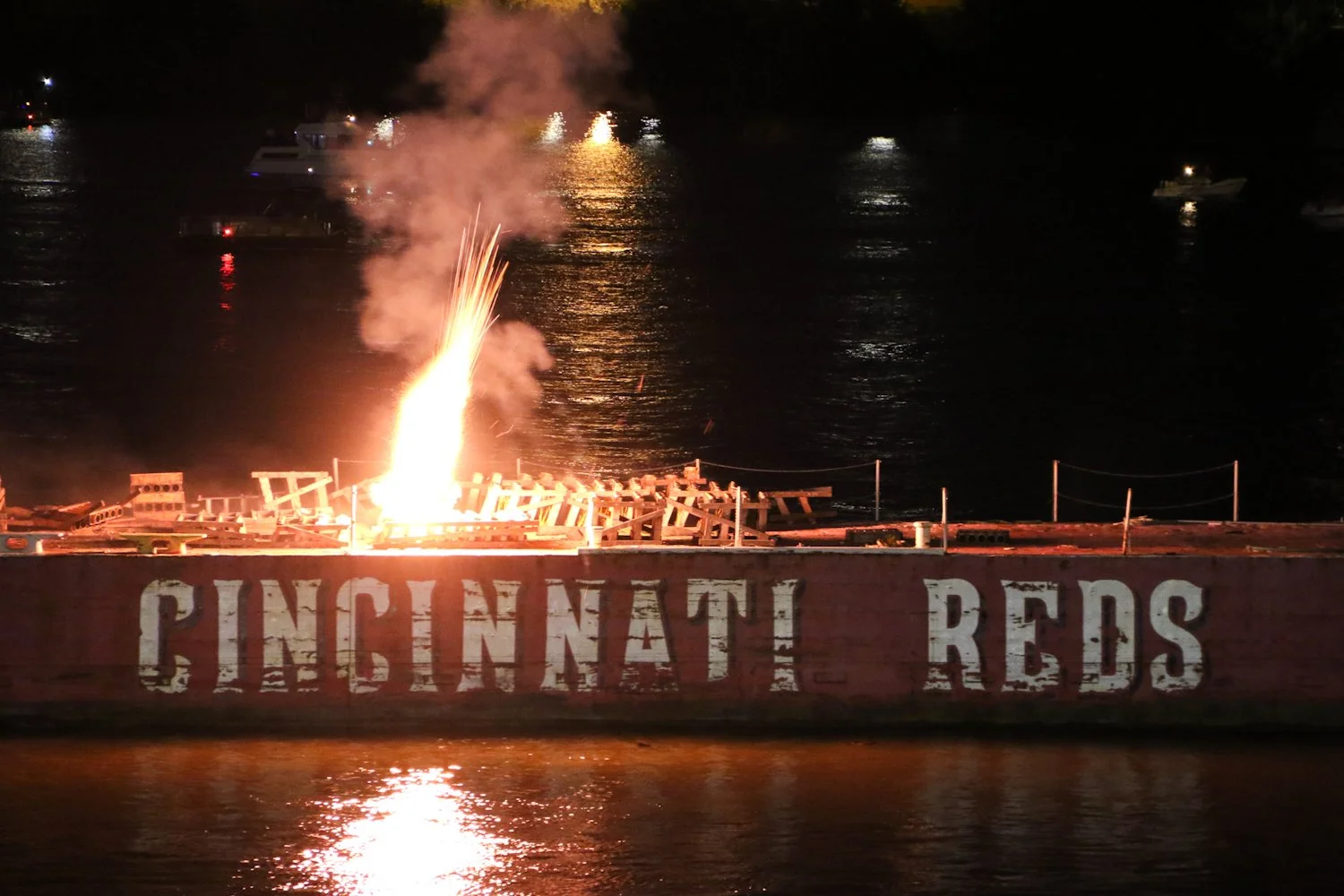 Walked down to the ballpark during the 8th inning when the game was tied 2-2. Hadn’t photographed fireworks in years, but I’d been seeing the barge parked at the riverfront all summer during runs and dog walks. When I got the idea for the shot in my head, I just assumed the barge would stay docked and remain still along the riverfront.