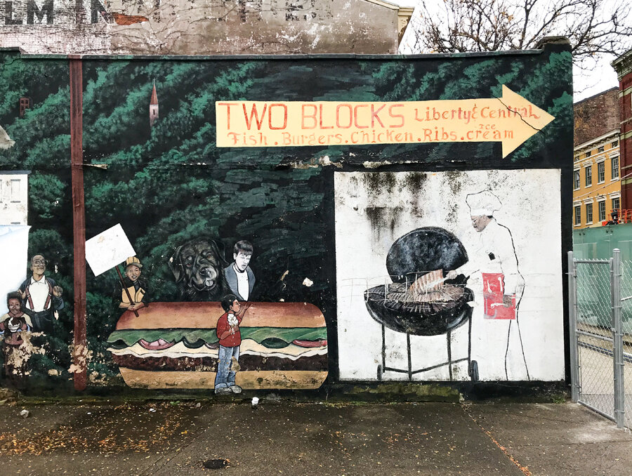 Unlike a lot of the fading advertisements seen on this site and in the book, this one isn't still promoting a business long after it's gone. Rather, the arrow directs passersby to where they can find Ollie's Trolley hawking excellent burgers and a selection of other southern comfort foods ranging from ribs to deep fried fish.