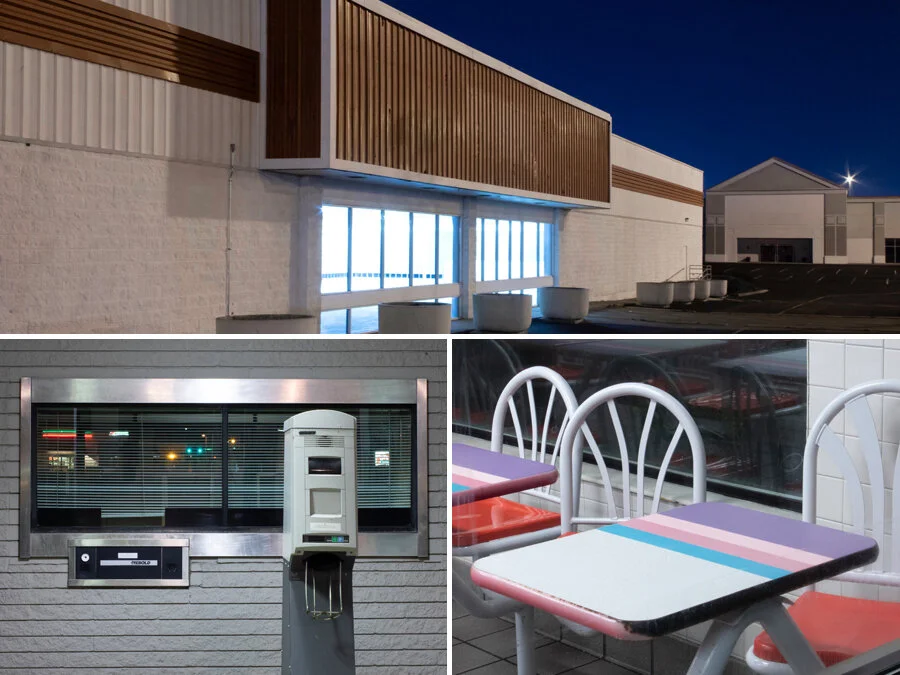 Some new Suburbia Lost entries that, despite their derelict status, are all aglow in the evening. An office supply store, a ubiquitous fast food restaurant, and a bank.