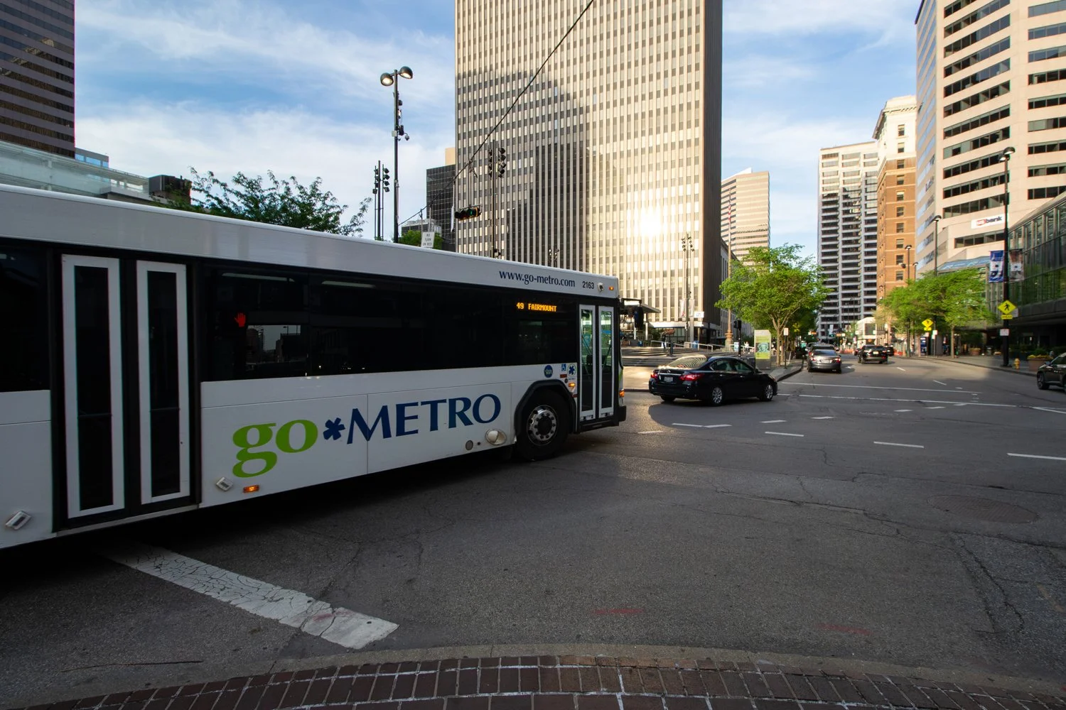The intersection of Fifth & Vine as seen from a METRO bus.