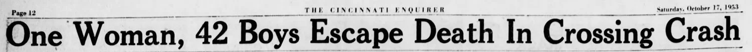 The story goes that his trolleybus became disconnected from the overhead wires and stalled upon some railroad tracks. Packed with “forty-two homeward bound high school boys and a lone woman,” Robert McGinley (“51, 2406 Spring Grove Ave”) ushered most of his passengers to safety before making one last attempt at restarting the bus. Although the approaching “double-diesel, 90 car” freight train had thrown its emergency break, the locomotive would still strike the stalled public transit vehicle.