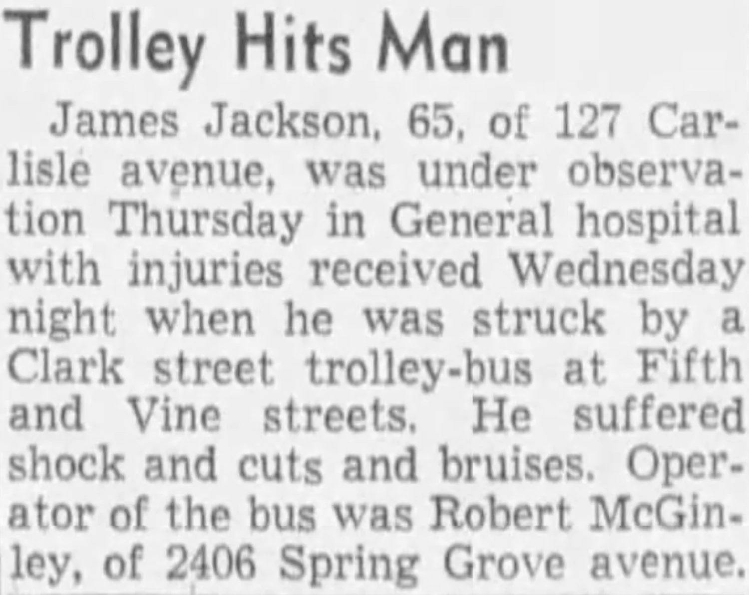 “James Jackson, 65, of 127 Carlisle avenue, was under observation Thursday in General hospital with injuries received Wednesday night when he was struck by a Clark street trolley-bus at Fifth and Vine streets. He suffered shock and cuts and bruises. Operator of the bus was Robert McGinley, of 2406 Spring Grove avenue.”