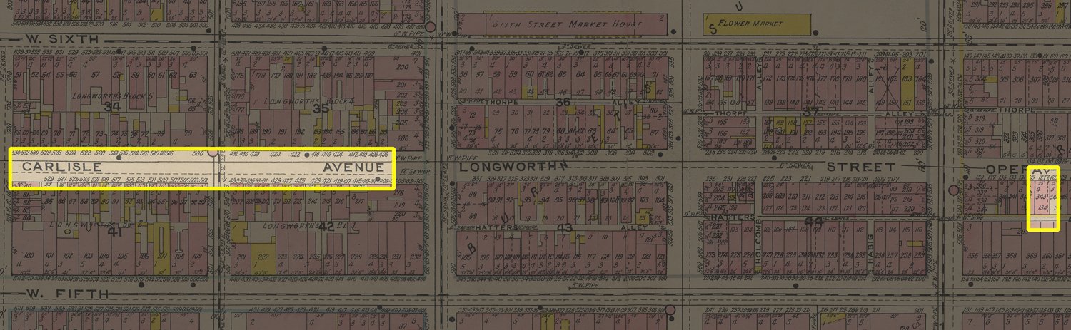 Carlisle Ave doesn’t exist anymore, a fact that would send me further down the rabbit hole when Google Maps™ returned zero results. Best as I could tell—Mr. Jackson’s domicile had been on a block surrounded by Fifth, Sixth, Elm & Race streets with Carlisle having once cut across the middle. The area’s now a quasi-public/private event plaza adjacent to the convention center.